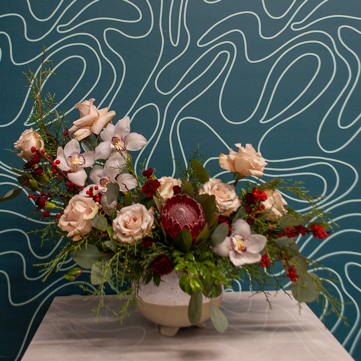 Celebrate the crisp elegance of winter with a bouquet that dances between rustic charm and refined beauty. Featuring neutral roses, striking protea, delicate ilex berries, lush Carolina sapphire, and silvery eucalyptus, this arrangement is the perfect for any holiday gathering or cozy night in.